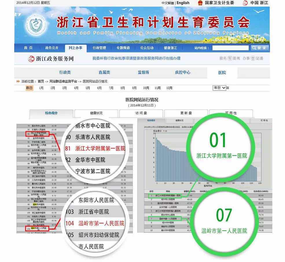 ▲升级改造后的浙大一院官网和温岭市第一人民医院官网,在同年的浙江省卫计委网站评测中分别从81名上升到第1名、104名上升到第7名。