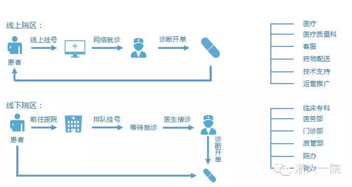 充分利用线下实体医院的资源(包括专家、设备、检查、检验等)来支持线上院区;在线上首诊所无法解决的病人则可以换更高级别的专家就诊;另外,这是一个开放的平台,可以和连锁药店、协作医院等相互连接。